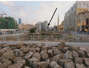 Figure 6. The Martyrs’ Square (with the Martyrs’ statue where indicated) and Roman ruins, Downtown, Beirut (adapted from Maria A. El Helou photo archive)