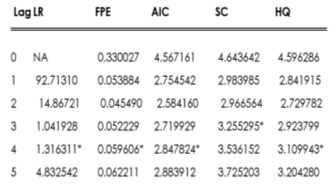 As mentioned earlier, this study applies the methodology proposed by the Toda and Yamamoto (hereafter TY). This approach is proper for any type of integration order. This method estimates a VAR model of (𝑝 + 𝑑) where 𝑝 stands for the lag order selected using available information criteria (like AIC or SIC) and 𝑑 denotes the maximum order of integration of the series.