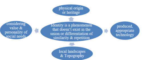 Lynch, (1960) clarified that the identity in urban spaces is formed by the entire values and characteristics of a city and should reflect the unique feature and individuality of the spaces (Lynch, 1960; Mach, 1993). The concept of identity is subjected to the urban context of the target area with human, expresses diversity and originality issues. Identity is a phenomenon that doesn’t exist in similarity and replication place. (Isin & Wood, 1999). Moreover, identity is the sum of different social, economic and environmental features that are used to show and distinguish assets within properties. The specialty of the social, ideology and culture, consistency is a significant concept that should be present in identity. Then, having a triumphant sense of Identity to users, the sustainability of certain conditions is necessary. Figure 3; shows the major four affective factors in creating the identity, which are relating to history (the origin or heritage), Social (considering value and personality of social needs), landscapes architecture (Environment and factors depending on topography), and appropriate technology (Gürsel, 1996).