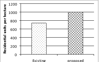 Related to this is the density of the development (Figure 5) that has increased by over 25% to almost 1000 units per hectare. However, the population density of individual units is likely to decrease as the unit sizes have increased by an average of 20%. This potentially results in more space per person in the units but assumes that the increased space standards will be realised rather than increased numbers for each tenancy to fill them up to previous standards.
