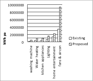 Electricity consumed by commercial and retail spaces will more than double (226% increase) in the new development (Figure 9). This is due mainly to the configuration of the commercial areas that, although having the same overall floor area as the existing development, have an external perimeter that has decreased by 63%. This reduces both daylighting and cooling by natural ventilation resulting in increased use of fans and air-conditioning as well as artificial lighting (Byrd, 2012). Although the light fittings may tend to be more efficient, this is likely to be offset by the opportunity for increased display lighting in retail areas.