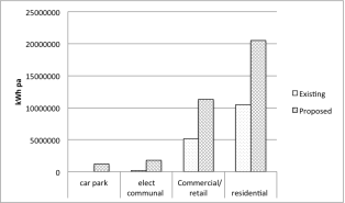 Residential electricity is the largest consumer on the site and almost doubles (196% increase) in the proposed development (Figure 8). This is combined with two new loads incurred by the development: i) lighting and ventilation to basement and podium car parks amounting to about 6% of the total residential load and ii) electricity use for other communal facilities that include; pumping water to the towers, lifts and lighting of corridors all of which amount to about 9% of the total residential load.