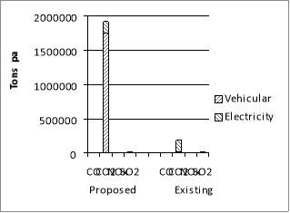 The amount of carbon emissions as a direct result of providing car parking spaces, where there were none previously, will depend on the type of vehicles and their travel patterns. The reduction in emissions due to changes of fuel (in particular CNG) has been assumed to be offset due to an increase in congestion as car ownership grows rapidly. Assuming 16 km/litre of fuel, the average carbon emissions per vehicle are 200gCO2/km. It is assumed that 80% of the 1400 car parking spaces are occupied and used regularly and that the average travel distance is 6km per day for recreation, occasional shopping and school drop-offs. This amounts to 25 kg per day or 491 tCO2 per year.