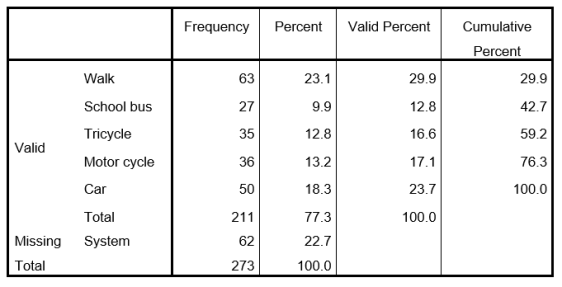 The principal mode of transport to secondary schools in Lokoja is by foot particularly when a short distance is involved. Table 1 reveals that 29.9% of secondary school students walk to schools in the city. This is at variance with the study carried out in Mission Hill School by Kim (2014), where 15% of children engaged in walking to school (Kim, 2014). The use of private cars for school trip was ranked second (23.7%) of the modal split in Lokoja. Approximately 16.6% and 17.1% of the sampled students rely on tricycle and motorcycle for trip to schools respectively. The result of this analysis reveals that more than 70% of the sampled students rely on automobile for their journey to school. The use of school bus for trip to school is ranked lowest (12.8%) among the children / students in Lokoja metropolis. This is contrary to the findings in a study of mode choice of transportation to schools in Abu Dhabi, the capital of United Arab Emirate. In the findings, Badri (2013) reported that 45% of children travel to school by car, while 38.1% rely on school buses. However, the use of school bus for journey to school in some of the advanced countries has been considered to be safer than the use of private cars to school (The Car Crash Detective, 2018).