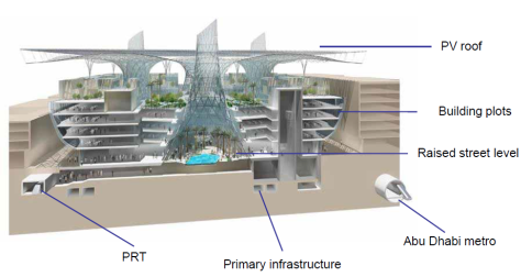 Besides, all the buildings in the City must meet a minimum 3-Pearl rating according to the Estidama Pearl Building Rating System, which is Administered by the Abu Dhabi Department of Municipalities and Transport (3-Pearl Estidama rating is comparable to the LEED Gold international green building certification). Nevertheless, it remains arguable whether the Masdar City project was promoted to the extent that it seemed unrealistic or a failure to some. Nevertheless, by 2019, only 10% of the entire project had been completed. Although it was planned to be a car-free city by replacing fuel-based transportation system with driverless Personal Rapid Transit (PRT) system (Figure 4), today electric vehicles and shuttles actively on the City roads of (Patel & Griffiths, 2013). From the humanistic perspective, it has been observed that the process was purposefully government-controlled instead of taking the concerns and desires of the local community (Lau, 2012).