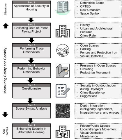 The research reviews theories and approaches concerned with the relationship between urban design and security, crime and fear of crime. In the case study, many techniques are utilized. First, data related to Prince Fawaz affordable housing project is gathered including rates and patterns of crime over the last three years. Second, a trace observation is tackled to monitor features associated with crime or fear of crime such as fences, protection iron and visual obstacles. Third, behaviour observation detects activities that might have a relationship with crime. Fourth, a questionnaire is conducted to explore levels of security in different spaces, places and times in which residents feel more vulnerable to crime, previous experience with crime, and prevailing types of crime. A sample of 360 questionnaires was distributed covering about 27% of the project’ units. The sample realizes a confidence level of 95%. The questionnaire form includes several closed-ended questions with bilateral answers; while, others are formulated in a Likert-type scale. At the end of the questionnaire, residents are asked about their suggestions for enhancing security. The urban pattern of the Prince Fawaz project then processed with Space Syntax. With Depthmap, many measurements are derived, and data obtained from observation and questionnaire are correlated. An interpretation of concluded results accompanied by recommendations for enhancing security and reducing crime in the Prince Fawaz project are then discussed (Fig. 1).