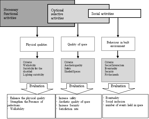 According to Gehl’s Model (Figure 1), different levels of activities may occur in public spaces, which can be regarded as an indicator of success in meeting users’ needs. Based on this model, the existence of necessary and optional activities in urban spaces contributes to an increase in social activities, although the level of each category of activities is related to the scale of space. This paper expands Gehl’s model based on the functional scale of urban spaces (in three case studies). Based on the aforementioned model, some criteria for functions of the spaces have been selected (Figure 2) and then, a questionnaire was designed to evaluate the quality of spaces for the aim of this paper.