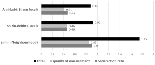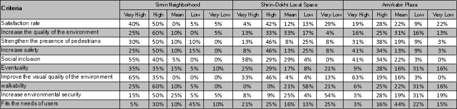 One of the criteria evaluated in this paper is the level of satisfaction of users from spaces in different scales. Researchers rate the satisfaction in three scales by the criteria such as satisfaction from the quality of implementation, ease of walking, security of space especially for the presence of women and children, the capability for hosting public and participatory events, visual quality of the landscape and attention to the needs of users. These indicators were assessed through a questionnaire completed by 30 users in each project (90 in total).