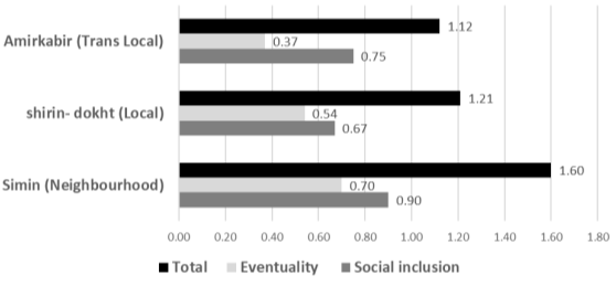 The results show that the effectiveness of the intervention is related to the scale of projects. On neighborhood scale, the sense of belonging is more noticeable, which can be attributed to the past familiarity with the environment. On the neighborhood scale, the presence of women and children is considerably higher than in other projects, which shows a sense of security in the space. This result can also be concluded from analysis of the “increasing security” criterion. The evaluation of the “satisfaction rate” criterion also shows that despite more facilities in Shirin-Dokht and Amir-Kabir spaces, the satisfaction level in Simin is significantly higher than the others, which indicates the stronger connection between users and space.