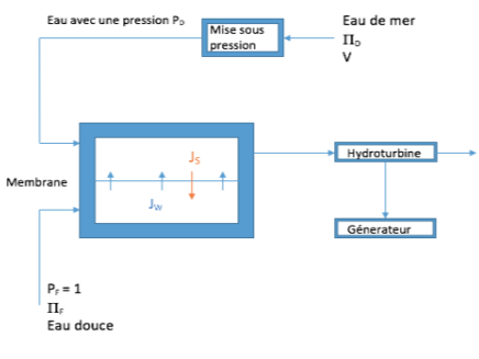 The basic energy production system is composed of a compression unit which delivers pressurized salted water injected in a chamber with a filtering membrane across which a flux of salted water Js is crossing, see Figure 1.