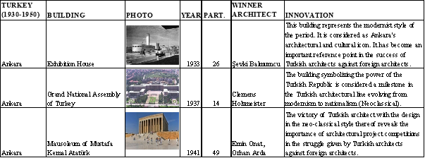 The selected buildings obtained through competitions and known as important examples of architecture and urbanism history by the innovations they have brought and the countries where they are located in are mentioned in the following tables (Tables 1 to 5).
