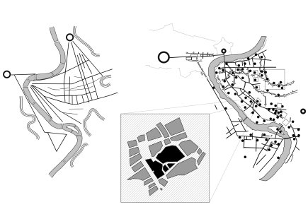Figure 2. In the first scheme we can see how the polarities of the Vatican and Piazza del Popolo influenced the orientation of the routes.In the second scheme we can see how the Roman routes, in black, persist and orient the medieval fabric of the city. The medieval paths are grafted onto the ancient ones and they grant the new churches, schematized in circles, with the ancient traces. The Roman monumental complexes, black squares, become catalysing elements of the new religious buildings. In the zoom the study area is synthesized through a schematization of the Bufalini's map; 1551.