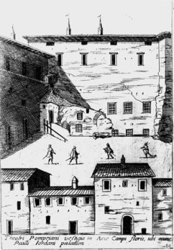 In the Mirabilia the area of the theater of Pompeo is identified with the term Templum probably because the part best preserved and still perceptible in its original form had to be that of the Temple of Venus Vincitrice that will be recurring element and urban land-mark in the history of this part of the fabric and that recurs with different names in the Orsini Archive documents. The history of the Orsini property is partly the history of the theater of Pompeo and through the writings it is possible to reconstruct it synthetically: in 1150 the first nucleus of the stronghold with the transfer of Trullum, between 1242 and 1268 the Orsini bought from their relatives of Monte Giordano all rights to the Arpacasa that can be identified with the temple of Venus. In fact, there is talk of a Camera Magna[6], probably the temple cell reused and transformed into a tower to defend the fortress built through the recast of the purchased particles. Between 1290 and 1296 the Orsini bought other portions of the area, and other residential and commercial properties both on Via dei Giubbonari, adjacent to Santa Barbara. With the purchase of properties between Via di Grottapinta, Piazza dei Satiri, Via dei Giubbonari, Piazza Campo de 'Fiori and the Biscione, the layout of the area is definitively configured. This fact was of primary importance for the family as it was possible to control the Valeria street, one of the main accesses for southern Italy and the Kingdom of Naples. This strategy of occupation and fortification was implemented by all the great Roman families in the strategic points of the city. The theater of Marcello transformed into a fortress was in fact a point of control of the passage of goods and pilgrims between the two banks of the Tiber.